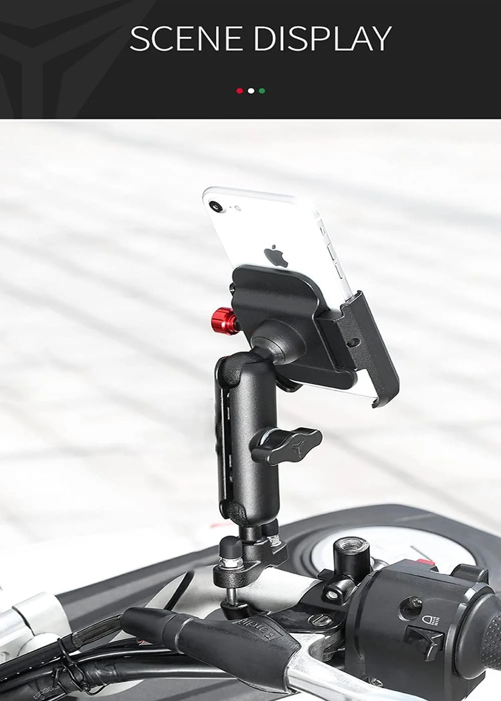 - Stem Mount for Free Adjustment: 3.74" stem clamping socket arms with double ballhead, the motorbike phone holder provides 360°& 360° rotatable angles to suit any views according to your vehicle handlebar height.