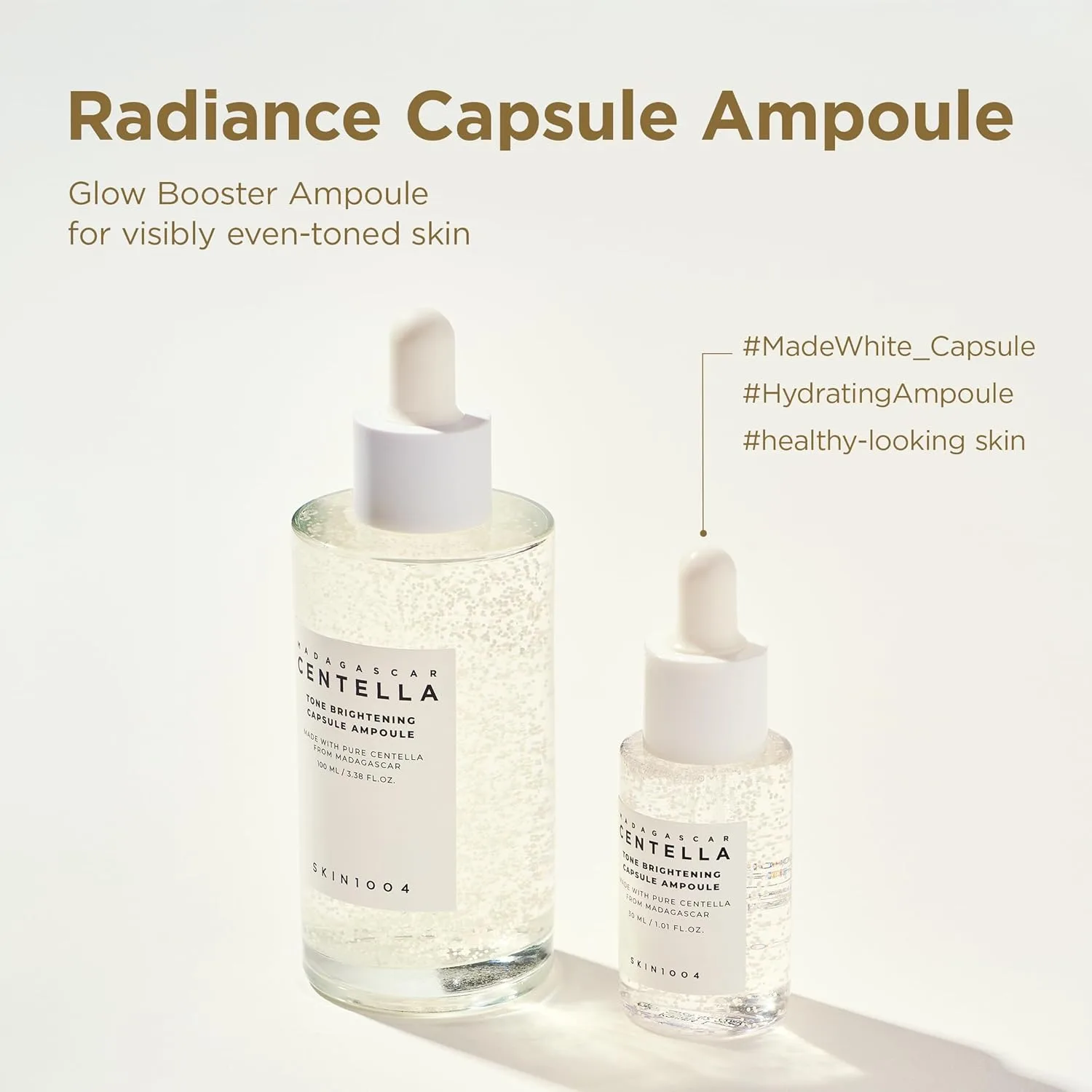 - TONE GLOWING CAPSULE AMPOULE FOR EVEN-LOOKING SKIN – This SKIN1004 capsule ampoule blends MadeWhite capsules into a refreshing hydrating serum texture that absorbs smoothly without stickiness, leaving skin soft, supple, and comfortable.
